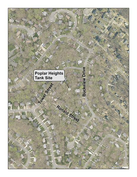 Fairfax Water has acquired additional property near the existing Poplar Heights Tank to accommodate the construction of the new tank after the existing tank has been demolished. The location is already established for water storage, centrally located within the portion of the water system the new tank will serve, and situated on locally high ground that will provide for optimal water pressure to the community.